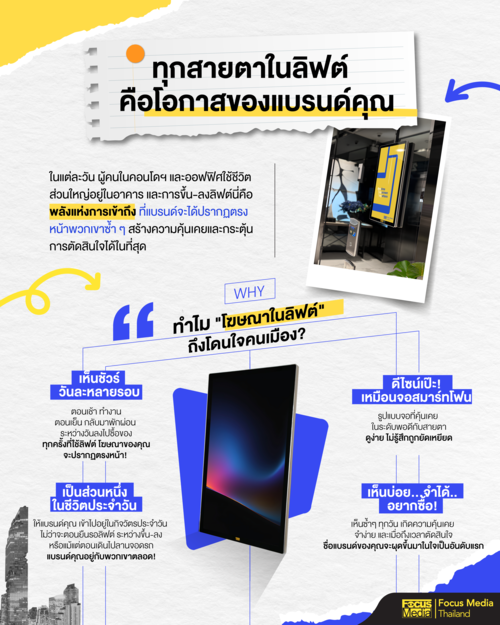 ทำไมคำกล่าวที่ว่า "ทุกสายตาในลิฟต์ คือโอกาสของแบรนด์คุณ" ถึงเป็นเรื่องจริง? และทำไมสื่อประเภทนี้ถึงทรงอิทธิพลต่อคนเมืองและชาวออฟฟิศ? บทความนี้มีคำตอบ